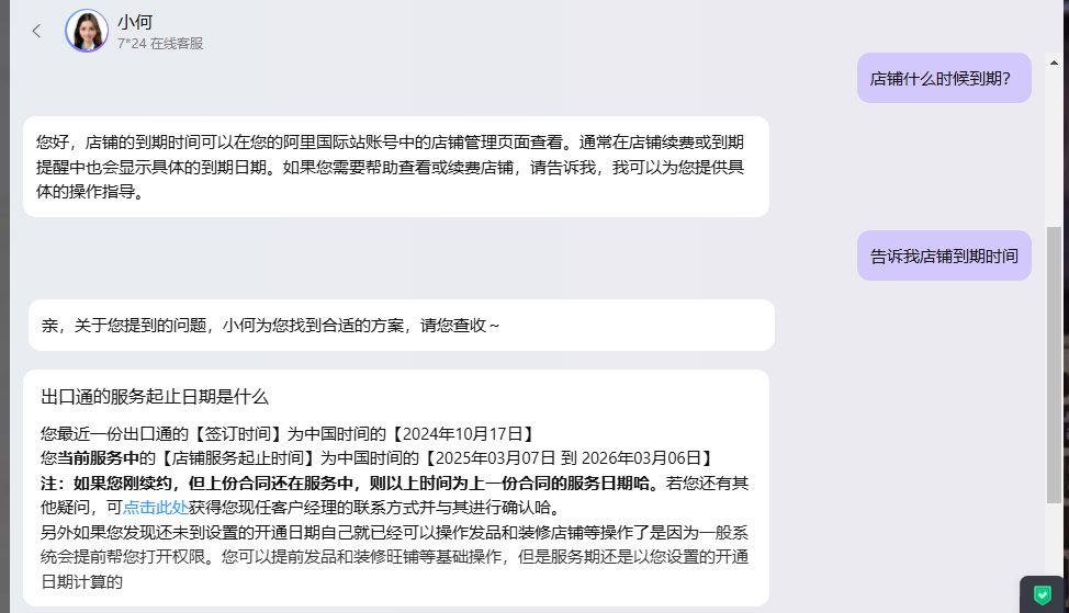 要查看阿里国际站的到期时间,可以登录您的账号后,通常可以在店铺右上角将鼠标悬停在显示的时间上,或者通过联系客服小何(例如点击首页的“客服小耳朵”,在聊天框输入“店铺什么时候到期”)来查询。
